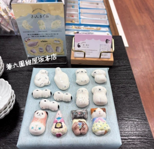 お箸置き、小皿、ポストカード、ブローチが並びます。